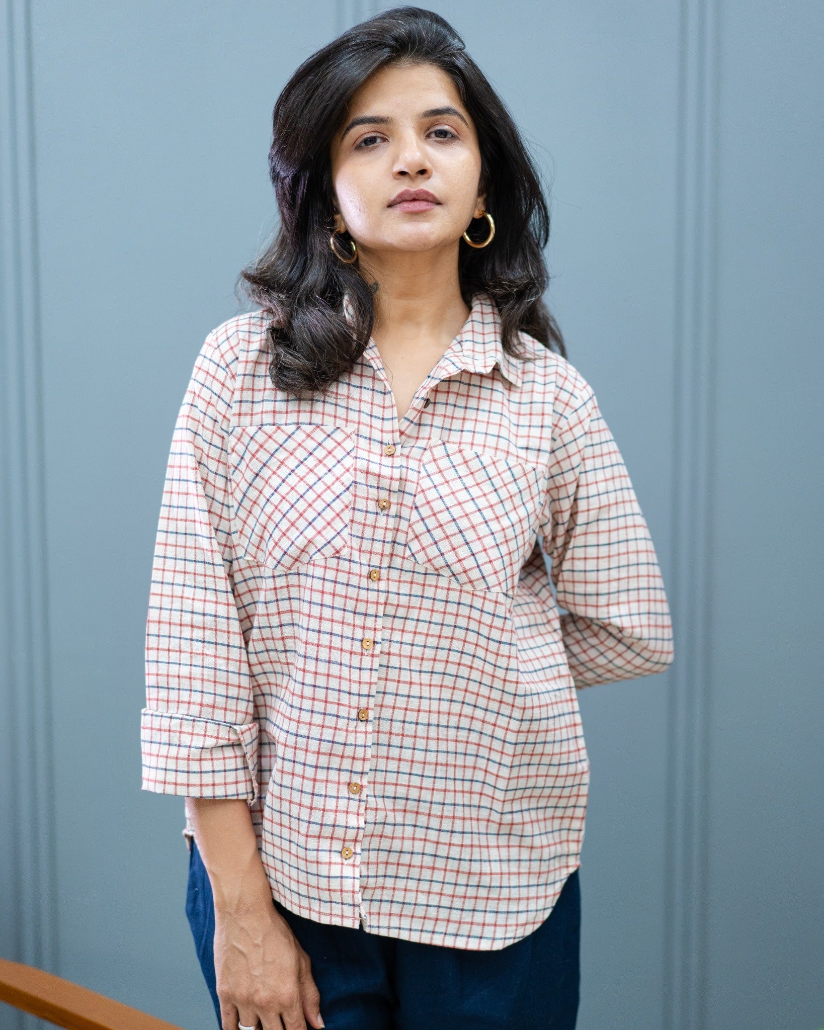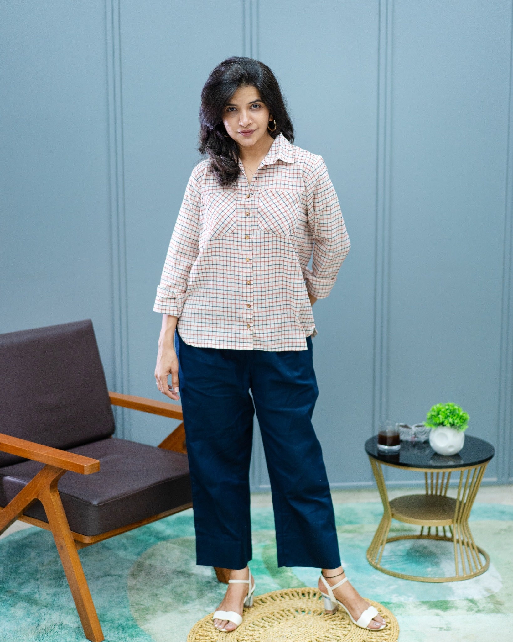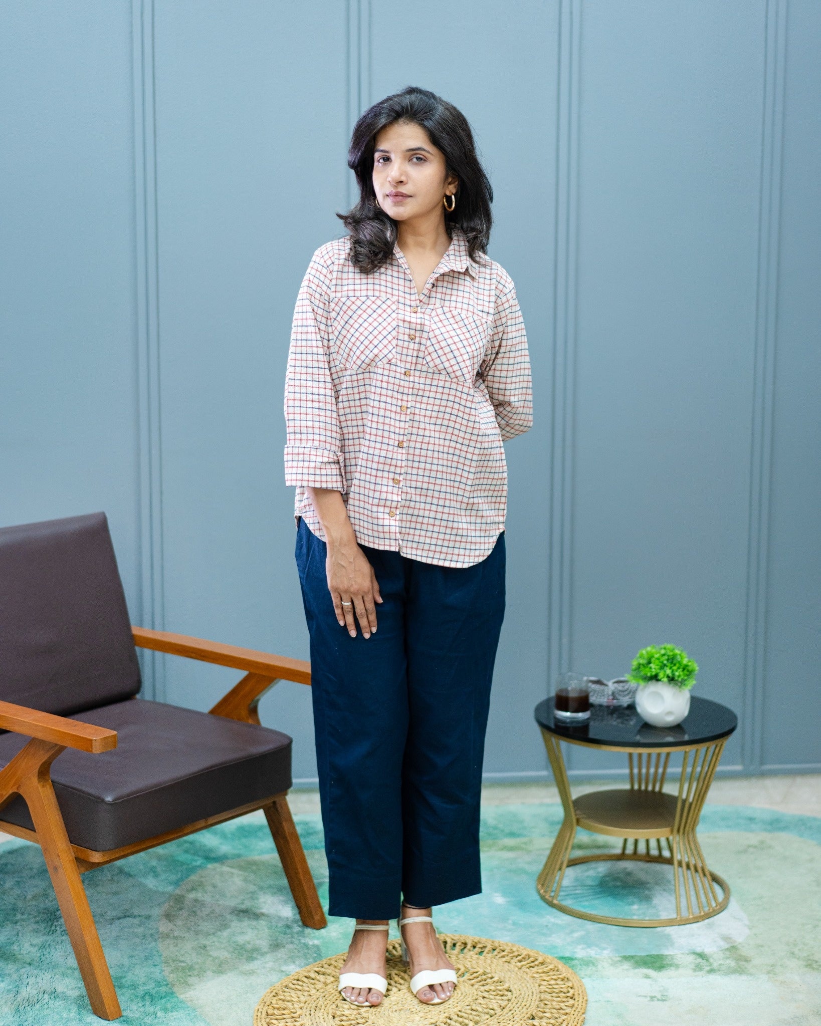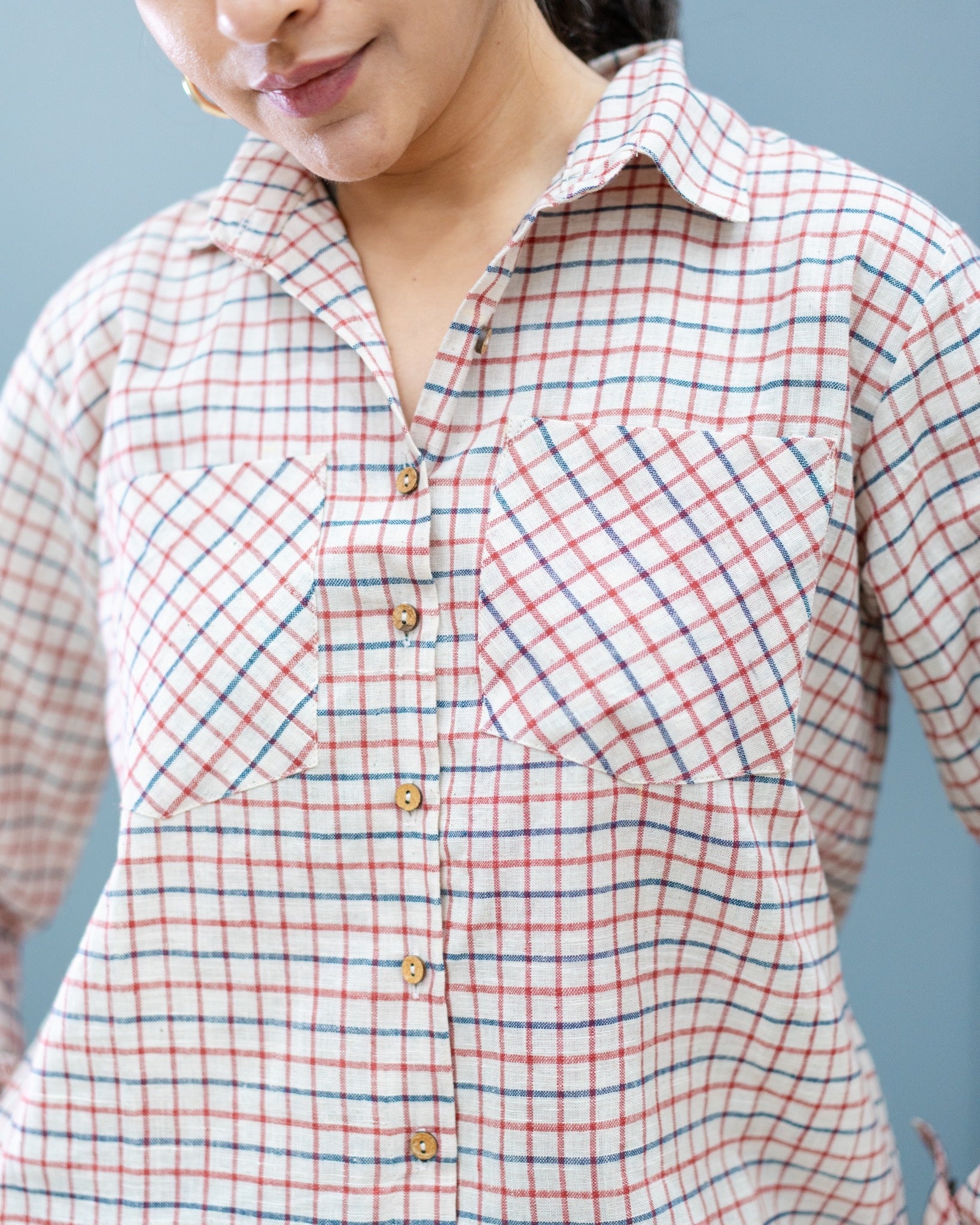 The inkberry grid shirt is crafted in soft handwoven cotton with red blue checks on ivory base. Designed with a sharp collar, wooden buttons and front panel detailing, it features two flap patch pockets for that added utility twist paired with cotton navy pants with inseam pockets.